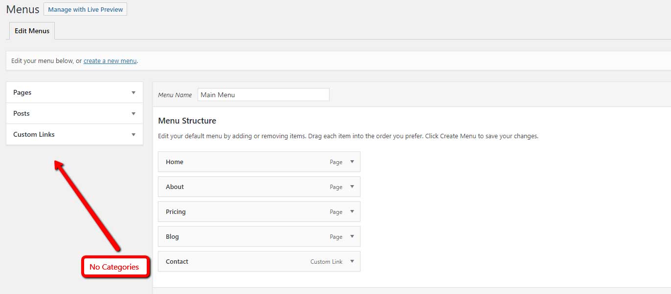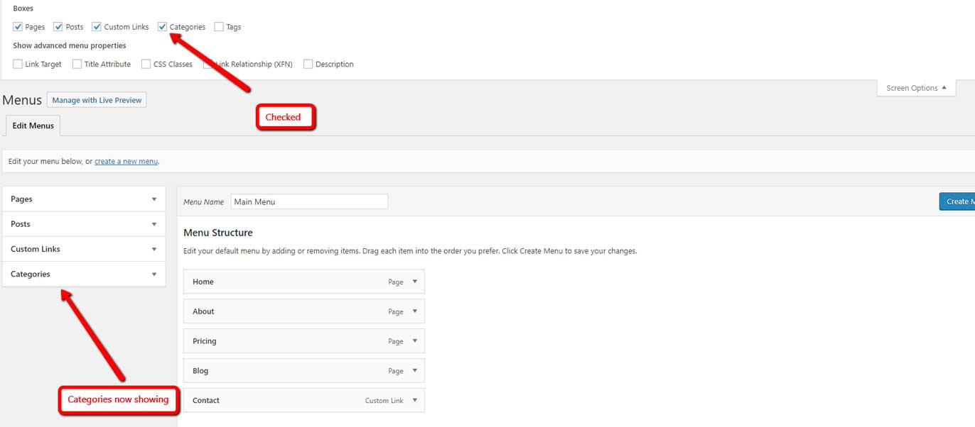 For example, you can see that “categories” is not showing as an option to add to the menu below.